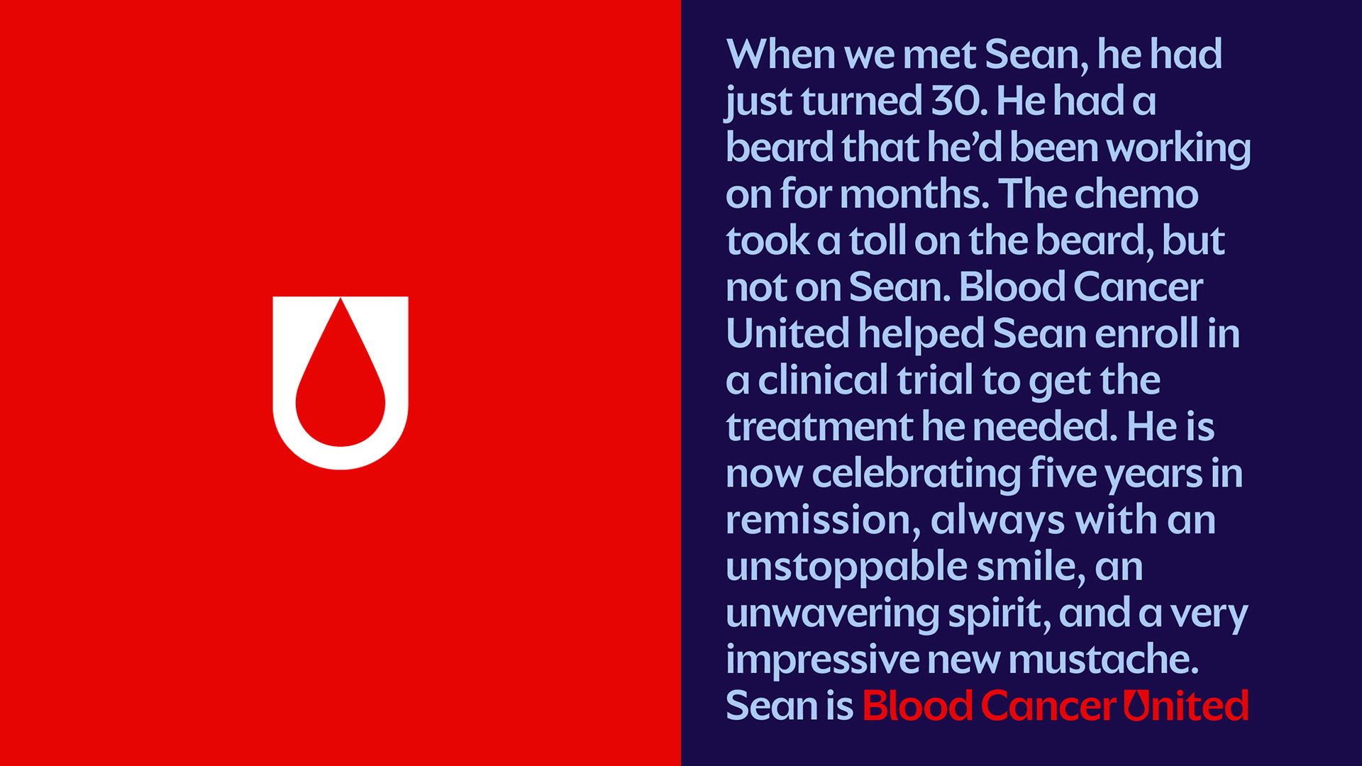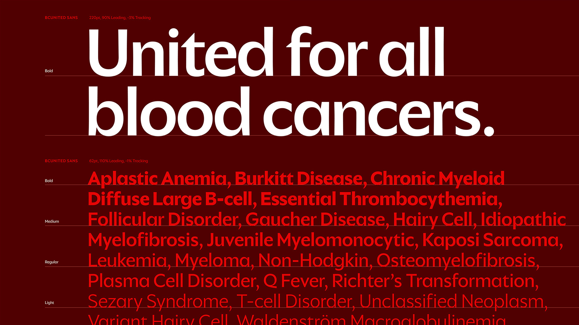 Identity and design direction for Blood Cancer United, previously the Leukemia & Lymphoma Society (LLS). More than a new name, it is a bold step forward. Awareness of blood cancers was below 5% and the old name no longer reflected the full scope of the mission.